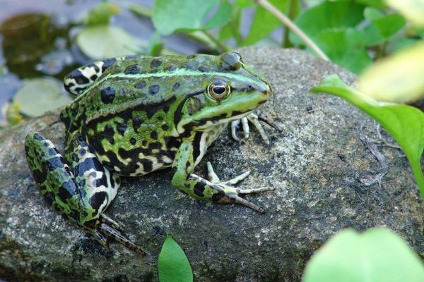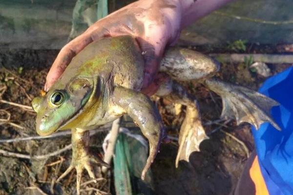 3、牛蛙个体特别大,成年蛙可达1500g左右,体长可超过青蛙一倍以上。