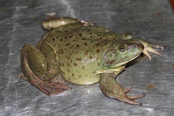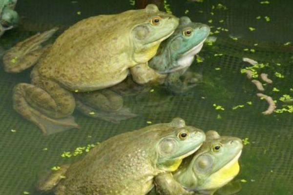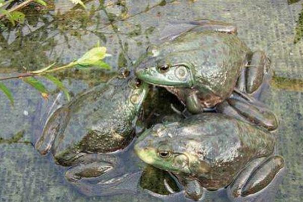 3、牛蛙十分贪食,且食量大,据观察,一只牛蛙一夜要吞食食物43.7克,牛蛙的吞食量与温度变化有关,水温21-30℃时摄食最多,20-14℃时食量最少,14℃以下停止摄食。