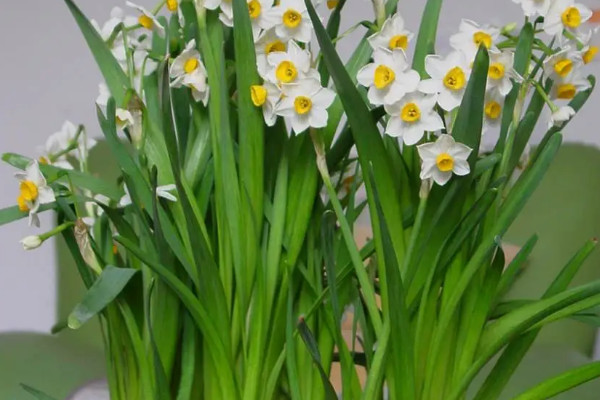 叶片特点:水仙花的叶片呈扁平的带状,成熟时叶长在30-50厘米。 花朵外形:花序轴从叶丛基部抽生,花朵小而娇艳,花色为白色。 生长习性:喜欢阳光充足的环境,具有一定的耐阴性。 繁殖多样:水仙花常以种子、侧芽、侧球繁殖。