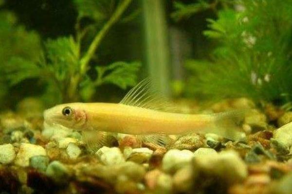 2、金苔鼠鱼:金苔鼠浑身是金色的,体长可达180毫米。喜欢生活在弱酸性水中,适宜的水温为15-30摄氏度,性情温和,适合在有水草或者沉木的水域生活。