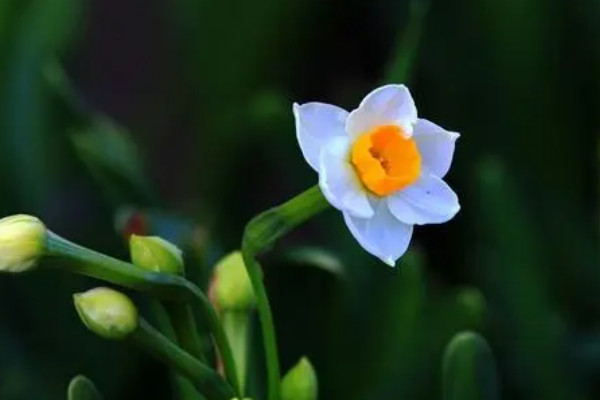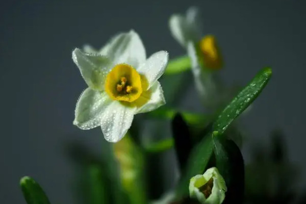 水仙花会在每年冬末春初时进入开花授粉期,此时花朵着生于枝叶间,颜色为白色,花蕊为黄色,叶片青翠浓郁,观赏价值极高,而且该阶段植株对养分的消耗较大,要及时补充磷钾肥,并控制氮肥的施加量,另外开花授粉是水仙花逐渐成熟的一个标志。