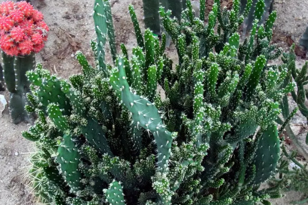 仙人掌属于丛生肉质灌木,株高为1.5-3米,上部分枝呈倒卵状椭圆形、近圆形或者倒卵形,边缘部分为不规则波状,颜色为绿色至蓝绿色,花朵呈辐射状,花丝为淡黄色,柱头为黄白色,紫红色浆果为倒卵球形。
