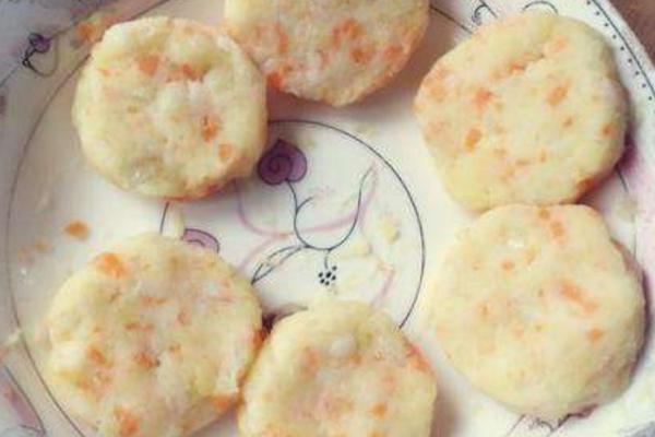3、蒸熟的土豆压成泥。胡萝卜去皮切末,锅烧热加少许油,转小火,将胡萝卜炒熟。