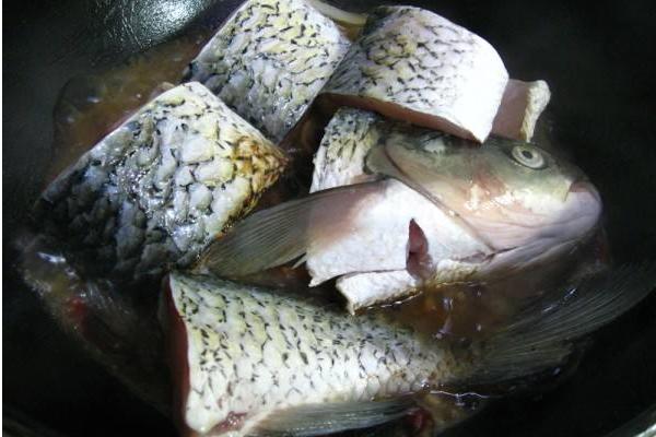 4、在锅中放入草鱼段,煸炒一下,再放入适量水,用小火炖。