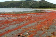 据外媒报道,近日有新西兰居民在丹尼丁奥塔哥半岛附近发现水域鲜红一片,仔细看发现了数量惊人的龙虾群被潮汐冲至岸边,染红了这片海。这种龙虾个头仅回形针大小,潮汐将它们带到岸边。
