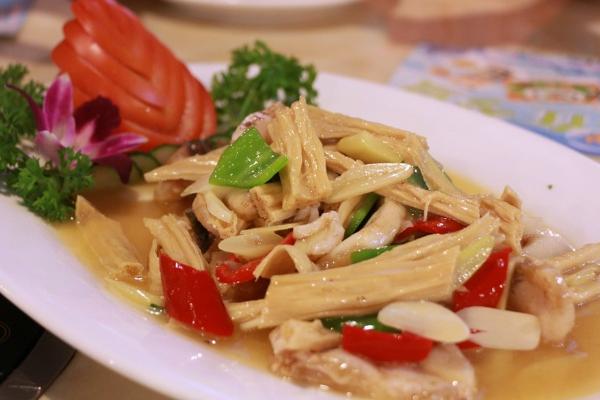3、下腐竹,溜点水、料酒、盐、生抽、姜将鱼焖熟。