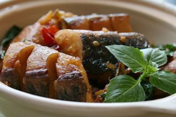 材料:草鱼250g、蒜仁、老姜片、红辣椒、葱、九层塔、蕃薯粉、蛋白、太白粉、盐、白胡椒粉、米酒、酱油膏、糖、麻油、米酒