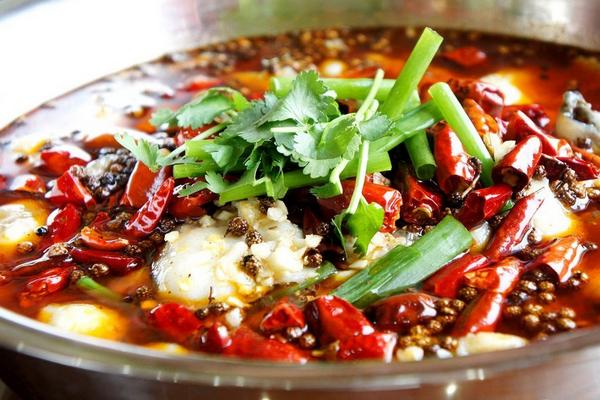 4、另用一锅,将小米椒、泡姜、泡缸豆、葱姜蒜、辣椒、花椒放入炒锅炒香,倒入鱼锅内即成。