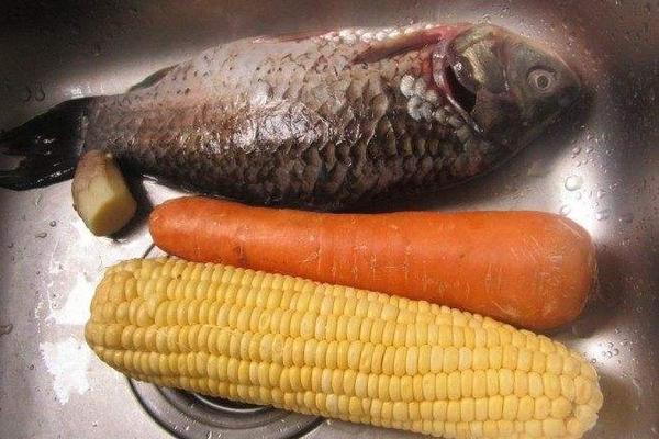 材料:鲫鱼2条、玉米、胡萝卜、马蹄、瘦肉、生姜、盐