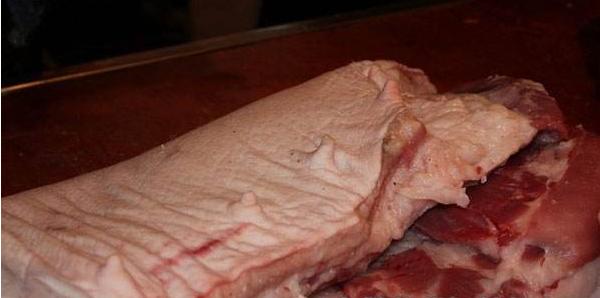 5、母猪肉的皮下脂肪比较脆硬,颜色为青白色,用手触摸时粘的脂肪比较少,有一些母猪肉,皮与皮下脂肪之间的有一层粉红色的薄脂肪。