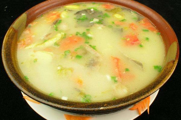 4、准备好什锦材料:胡萝卜细丁、肉末丁、葱丁、湿红薯粉水、鸡蛋1个打散;5、把胡萝卜细丁在热锅中先干炒一会再倒入鲶鱼汤,煮开后两分钟,倒入肉末丁等水开,再倒入湿红薯粉水,不停搅动,最后注入鸡蛋液;