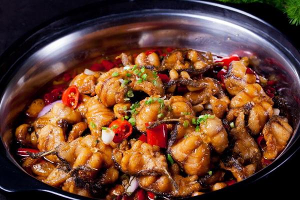 4、下泡椒蓉、豆瓣炒香加入适量鲜汤调味烧沸后下鲶鱼烧至入味且汤汁浓稠时起锅装盘。