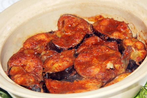 1、鲶鱼洗净用清水冲净粘液然后切成大块,用盐、胡椒粉、料酒腌渍入味;姜切片、干辣椒剪成小段;