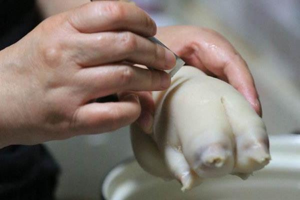 3、烫后的猪蹄表面皮肤是比较松软的,热胀冷缩的原理,然后使用拔毛器会在钝器直接在猪蹄上刮,可以去掉大部分猪毛的,在猪蹄的褶皱会在脚趾甲窝里边还会残留一下毛需要进一步处理。