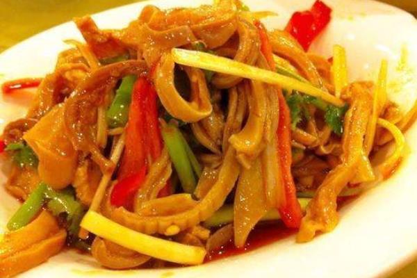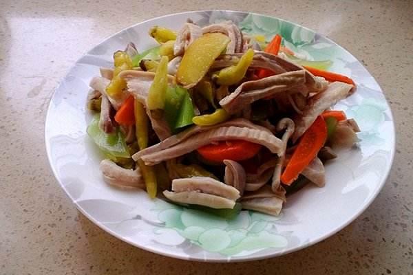 1、红烧猪肚:猪肚洗干净,煮熟切片,冬茹、红椒、生姜都切片,香葱切段。烧锅下油,放入姜片、冬茹、猪肚炒香,再加入鸡汤,调入盐、味精、白糖、老抽王烧透。然后撒入胡椒粉。