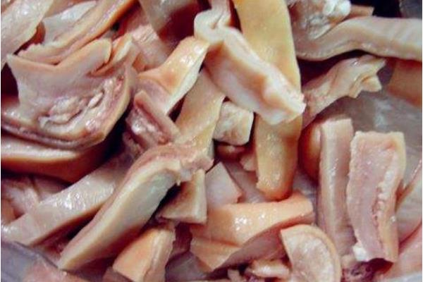 3、要除去猪肚上的污秽和臊味,可先用面粉把猪肚擦一遍,放在清水里洗去污秽粘液,然后放进开水锅中煮至白脐结皮取出,再放在冷水中,用刀刮去白脐上的秽物。外部洗净后,从肚头(肉厚部分)切开,去掉内壁的油污,再取少量的醋和食盐,擦搓肚子,以去除臊味。