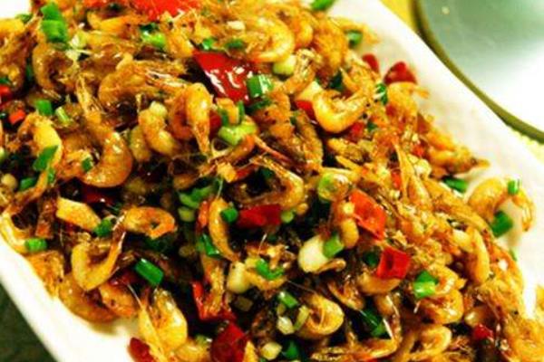 做法:河虾洗净沥水。锅烧热放油,爆香姜片,放入茶叶翻炒。后倒入河虾,加料酒,炒熟后加盐鸡精调味。最后撒葱花出锅。