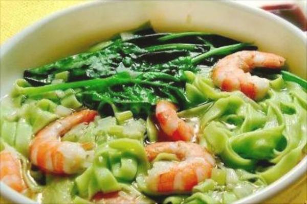 原料:面条、熟鸡肝末、新鲜虾肉、菠菜末、鸡蛋、植物油、适量高汤