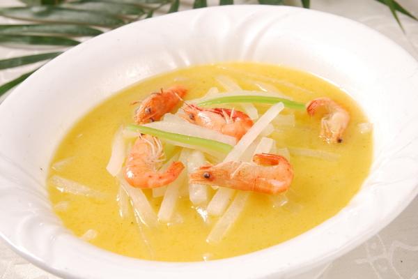 4、放入河虾、萝卜丝小火煮5分钟左右,加盐、糖和胡椒粉调味;