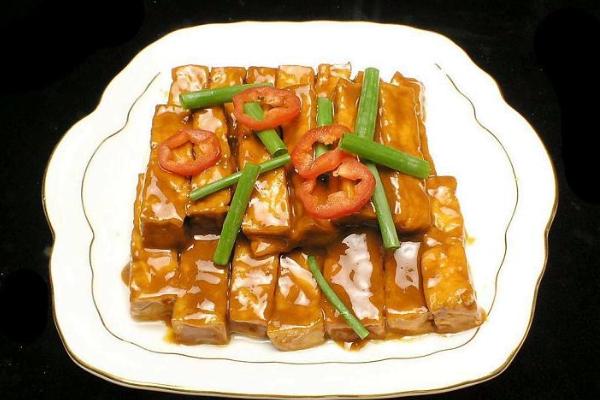 3、放入煎好的豆腐,加盖烧3分钟后,淋入水淀粉勾芡即可。