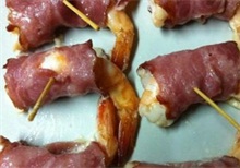 4). 用培根把基围虾卷好,每一层培根要有重合部分。