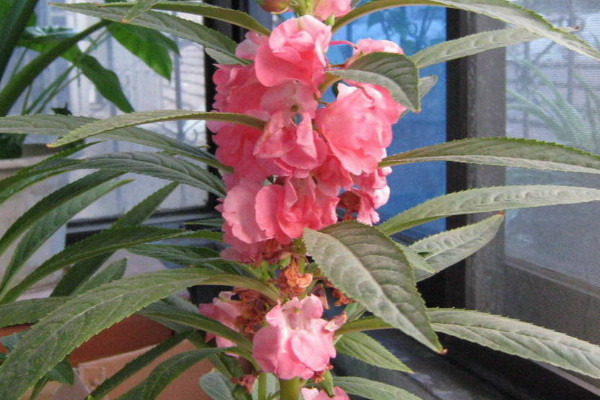 凤仙花的株高为60-100厘米,肉质的茎直立粗壮,分枝能力较弱,且具有多数纤维状根,叶片互生,呈披针形、狭椭圆形或倒披针形,花朵单生或2-3朵簇生于叶腋,花色为白色、粉红色或紫色。