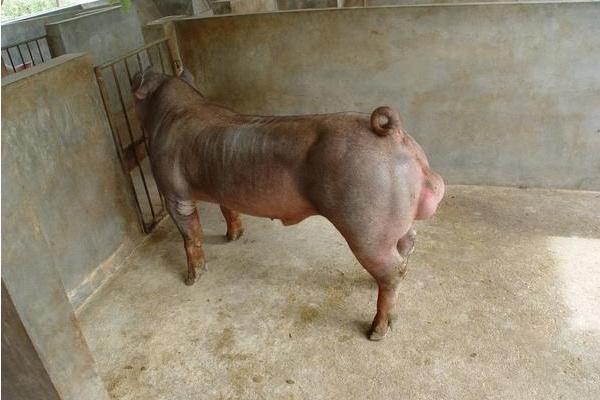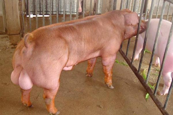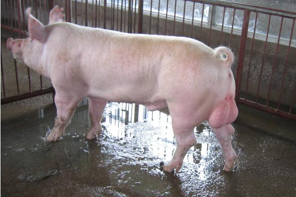 种公猪的整体结构要匀称,头颈、前躯、中躯和后躯结合自然、良好,眼观有非常结实的感觉。头大而宽,颈短而粗,眼睛有神,胸部宽而深,背平直,身腰长,腹部大小适中,臀部宽而大,尾根粗,尾尖卷曲,摇摆自如而不下垂,四肢强壮,姿势端正,蹄趾粗壮、对称,无跛蹄。