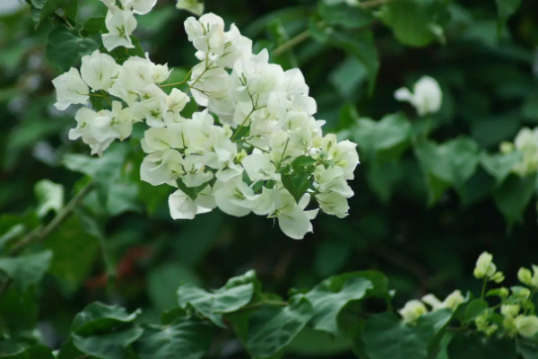 银叶白三角梅的外形独特,其叶片边缘全都为银白色,茎干刺小并且不明显,枝条柔软,花朵颜色纯白,花期在每年十月份,等到次年二月份就会凋谢。