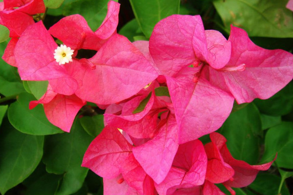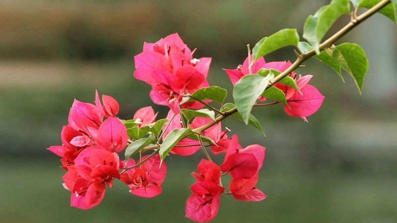 三角梅的叶子为椭圆形、卵状披针形,颜色为绿色,长度在8厘米到13厘米之间,且叶子先端稍尖,基部较为圆润,边缘光滑无锯齿,叶柄较短,长约1厘米,养殖三角梅时,要在生长期每周施一次肥,并定期修剪残花、密集枝。