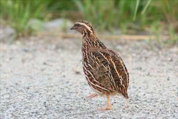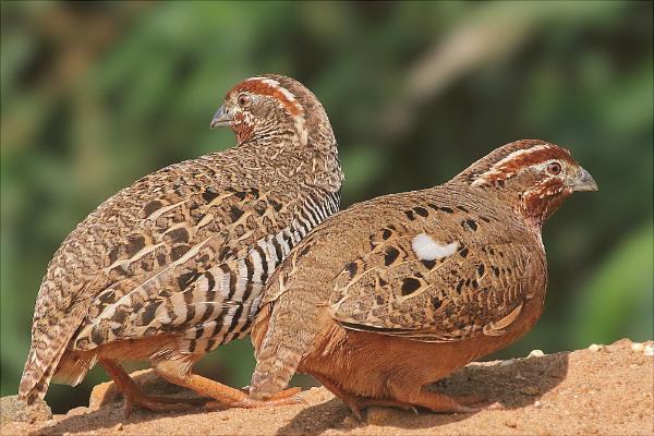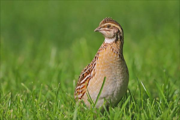 1.鹌鹑,体长18厘米,身体小而圆,褐色带明显的草黄色矛状条纹及不规则斑纹,雄雌两性上体均具红褐色及黑色横纹。常成对而非成群活动。经常活动在生长着茂密的野草或矮树丛的平原、荒地、溪边及山坡丘陵一带,有时也到耕地附近活动。分布于欧洲、非洲、亚洲北部、中部、西部和南部等,在中国繁殖于新疆西部的莎车、裕民等地至东部的罗布泊,越冬于西藏南部和东南部,有时也到云南西北部的中甸。