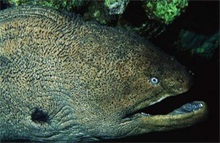 【原形态】 海鳗,体长圆筒形,后部侧扁。一般体长50cm以上,大者长100cm以上重达10-20kg以上。头尖长。吻突出,尖端下突如小钩状。眼大,近圆形,眼间隔微隆起。鼻孔每侧2个,前鼻孔短管状;后鼻孔圆形,口大,上颌突出,略长于下颌,两颌牙强大而锐利,均为3行,前端均有大型犬牙,上颌有8-16个;下颌为6-7个,下颌外行牙不向外倾斜。犁骨中间一行有10-15个大扁牙,牙基部前后各有1小尖牙。鳃孔宽大。肛部位于体中部偏前。体光滑无鳞。侧线孔明显。背鳍起点在胸鳍基部稍前上方。有胸鳍无腹鳍。背、臀在后方和尾鳍连接。体背侧银灰色。大型个体暗褐色。腹侧乳白色。背、臀、尾鳍边缘均黑色,胸鳍灰色。
