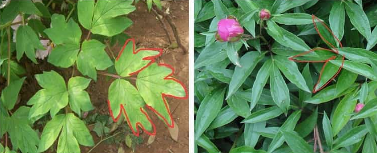 -上图可以看出,牡丹的叶片是像鸭掌一样的,前端1/3处有分裂,而芍药的叶片则像鸡爪一样,是完全分裂的。这一点很容易区分,当看到叶片长的比较像鸭掌,那么就是牡丹,如果叶片长的像鸡脚,那就是芍药。