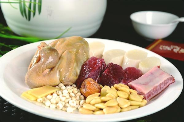 2.药材等配料清洗干净放入容器中,加少许水,采用蒸炖的方法,煨7-8小时即可。