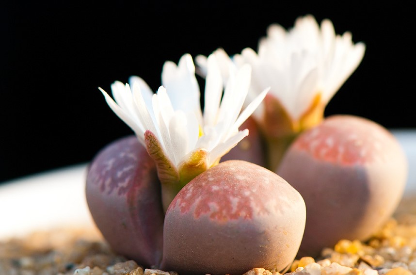原产南部非洲,喜温暖干燥和阳光充足环境,怕低温,忌强光暴晒,它还有一个奇特之处是会分头,生石花在老叶衰老枯干后,会从老叶里边生出新的叶子,单头的生石花有时还会分成双头。