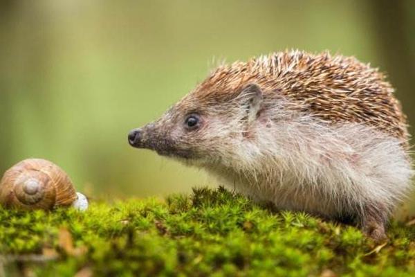 2、刺猬:刺猬体肥矮、爪锐利、眼小、毛短,浑身布满短而密的刺,体背和体侧满布棘刺,头、尾和腹面被毛,嘴尖而长,尾短,前后足均具5趾,蹠行,少数种类前足4趾,齿36~44枚,均具尖锐齿尖,适于食虫,受惊时,全身棘刺竖立,卷成如刺球状,头和4足均不可见。