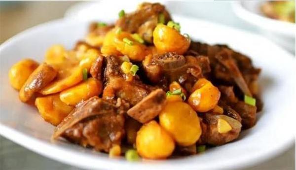 4、炒勺加油烧至七成热时,放入山鸡块,炸至金黄色捞出;再放入板栗炸至浅黄色捞出;