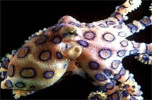 蓝环章鱼体型约7公分,高尔夫球大小,主要出没地澳洲、日本、西北太平洋海域,具神经性剧毒,遇骚扰或攻击会以有毒的喙反咬,被咬后全身麻痹致死,目前尚无解毒剂。
