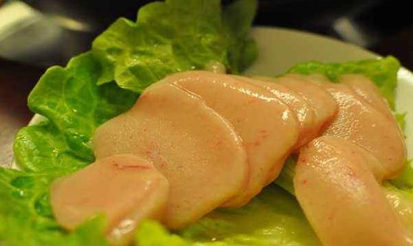 4、驴鞭在百年老汤中氽烫,不宜过熟,捞出后沥干水份,用生菜叶垫底,热油爆香大蒜、红葱片,加酱油,直接浇在驴鞭上即可。