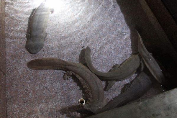 2、娃娃鱼天然饵料资源比较丰富,主要为蛙、贝、鱼、虾、泥鳅、鸡鸭胚胎、蚯蚓、兔肉、羊肉、牛肉等,天然饵料饲养成体的饵料系数为3.5-6.3,因此可根据养殖地区饲料资源情况,来选择投饵品种。