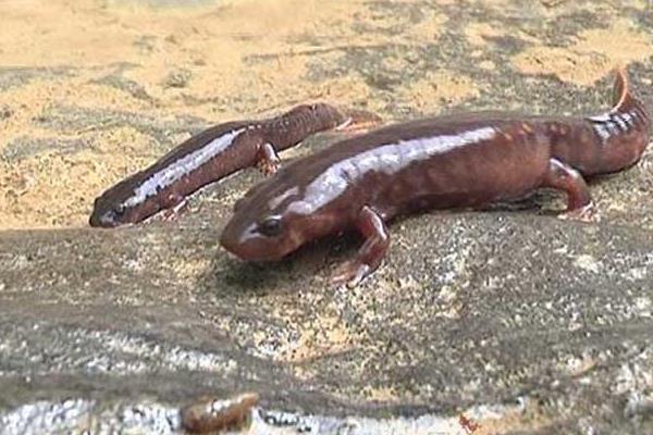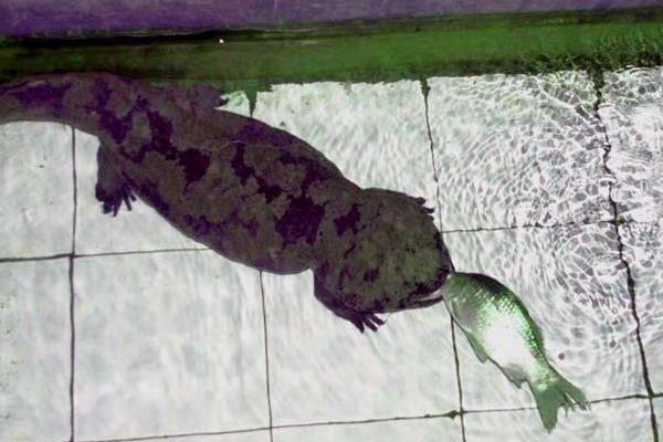 两栖脊索动物,有尾目中最大的一种,在两栖动物中要数它体形最大,全长可达1米及以上,体重最重的可超百斤,而外形有点类似蜥蜴,只是相比之下更肥壮扁平。最近科学家研究:大鲵小时候用的是鳃呼吸,长大后用肺呼吸。大鲵栖息于山区的溪流之中,在水质清澈、含沙量不大,水流湍急,并且要有回流水的洞穴中生活。大鲵头部扁平、钝圆,口大,眼不发达,无眼睑。