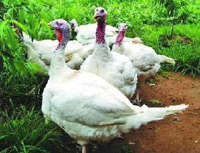 ( 6 )贝兹维尔火鸡:该品种身体细长,步伐轻快,体态健美。胫和趾为粉红色,冠及肉髯红色。具有早熟、饲料适应性强、生长迅速、肉质鲜美、产蛋多等优点。成年公火鸡体重10 千克,母火鸡5 千克以上。平均产蛋率可达60 % ,平均蛋重76 克。该品种商品火鸡14 ~16 周龄上市,平均体重3 . 5 ~4 . 5 千克。