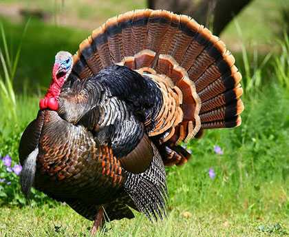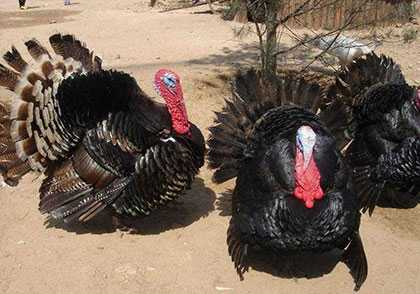 ( 1 )青铜火鸡:原产于美洲,是世界上最著名、分布最广的品种。公火鸡颈部、喉部、胸部、翅膀基部、腹下部羽毛红绿色并发青铜光泽。翅膀及翼绒下部及副翼羽有白边。母火鸡两侧、翼、尾及腹上部有明显的白条纹。啄端部为深黄色,基部为灰色。成年火鸡体重巧千克,母火鸡9 千克。年产蛋50 ~60 枚,蛋重75 ~80 克,蛋壳浅褐色带深褐色斑点。刚孵出的雏火鸡头顶上有3 条互相平行的黑色条纹。雏火鸡胫为黑色,成年后为灰色。青铜火鸡性情活泼,成长迅速,体质强壮,体形肥满。