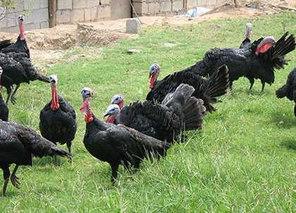 ( 9 )贝蒂纳火鸡:贝蒂纳火鸡是由法国贝蒂纳火鸡育种公司培育成的。有小型和重中型两种,小型品种适合于粗放饲养,重中型品种适合于工厂化饲养。贝蒂纳小型火鸡有白羽和黑羽2 种,成年公火鸡体重9 千克,母火鸡5 千克左右。可自然交配,受精率高,25 周平均产蛋93 . 69 枚。