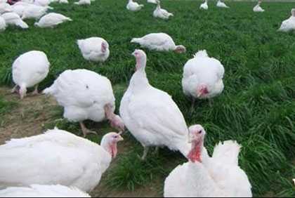 ( 2 )荷兰白火鸡:原产于荷兰,全身羽毛白色,因而得名荷兰白火鸡。体形与加拿大海布里德中型品系相似,啄、胫、趾淡红色,皮肤纯白色或淡黄色。成年公火鸡体重15 千克,母火鸡8 千克。雏火鸡毛色为黄色;公火鸡前胸有一束黑毛。