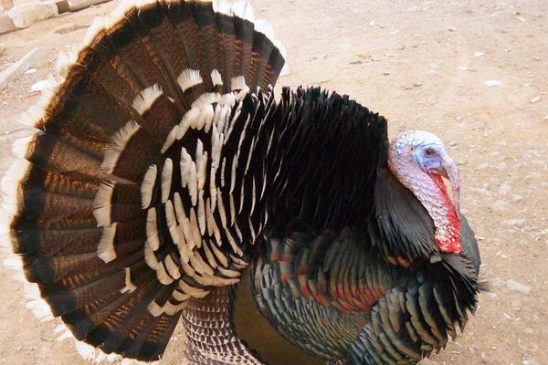 2、羽毛颜色随品种而异。成年公火鸡喙上有肉髯垂下或覆盖喙上,颈上及喙下珊瑚状皮瘤特别发达;羽毛闪闪有光,胸前有须毛束,尾羽发达,能展成扇形,如孔雀开屏;胫上有距。母发鸡头小,在额前有一肉冠,皮瘤小,个体也小于公火鸡,且胫上无距,尾羽不展开。