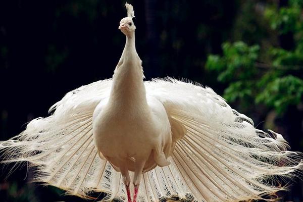 4、白孔雀:白孔雀属于鸡形目雉科孔雀属鸟类,全身洁白无瑕,羽毛无杂色,眼睛呈淡红色。开屏时,白孔雀就像一位美丽端庄的少女,穿着一件雪白高贵的婚纱,左右摆动,翩翩起舞,非常美丽。白孔雀是印度孔雀的变异,平均一千只蓝孔雀中才能变异出一只白孔雀,黑孔雀低于千分之一。