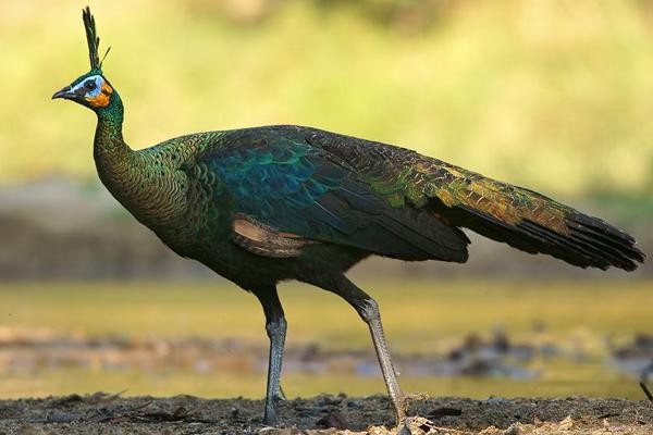 2、绿孔雀:绿孔雀即爪哇孔雀,冠羽长条形,脸颊呈鲜黄色。雄性能开屏而闻名于世,雀羽毛翠绿,下背闪耀紫铜色光泽,尾上覆羽特别发达,平时收拢在身后,伸展开来长约1米左右,就是所谓的孔雀开屏,羽毛绚丽多彩,羽支细长,犹如金绿色丝绒,其末端还具有众多由紫、蓝、黄、红等色构成的大型眼状斑,开屏时反射着光彩,好像无数面小镜子,真鲜艳夺目。