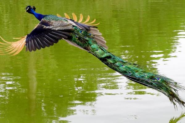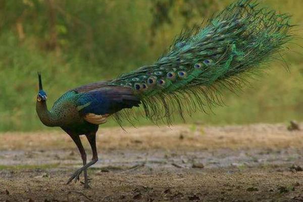 2、绿孔雀:绿孔雀分布于东南亚,我国仅见于云南西部和南部,野生数量稀少,为中国国家一级保护动物,喜欢在疏林草地、河岸或地边丛林以及林间草地和林中空旷的开阔地带活动。