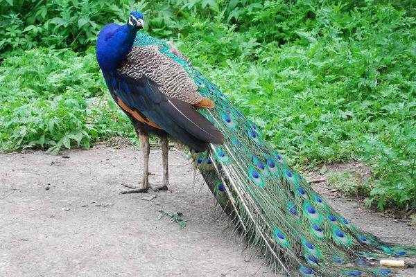 2、蓝孔雀:蓝孔雀的体型相对较小一些,腿、颈和翎羽较长,但是缺乏鞍羽。