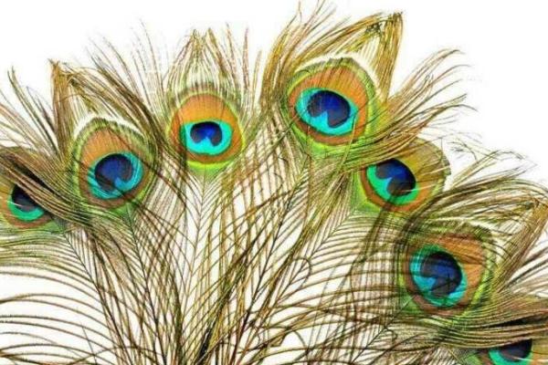 雄孔雀尾部的羽毛延长成尾屏,有各种彩色的花纹,开屏时非常艳丽,像扇子。这些羽毛绚丽多彩,羽支细长,犹如金绿色丝绒,其末端还具有众多由紫、蓝、黄、红等色构成的大型眼状斑,开屏时反射着光彩,好像无数面小镜子,鲜艳夺目。也有不少人会觉得这些漂亮羽毛像是五彩斑斓的绸缎。